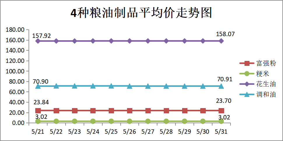 我区监测的8种粮、油中,富强粉、粳米、花生油、调和油4种代表品5月下旬商超、农贸市场平均价格及变化情况如下: