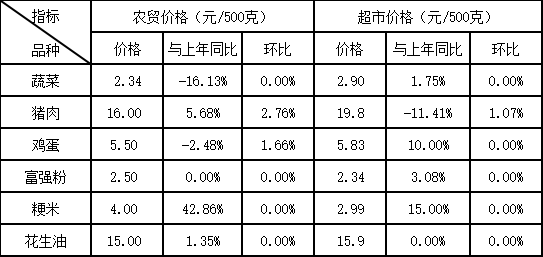 粮油:富强粉的农贸、超市平均价格分别为每500克2.50元、2.34元。粳米的农贸、超市平均价格分别为每500克4.00元、2.99元。花生油的农贸、超市平均价格分别为每500克15.00元、15.90元。
