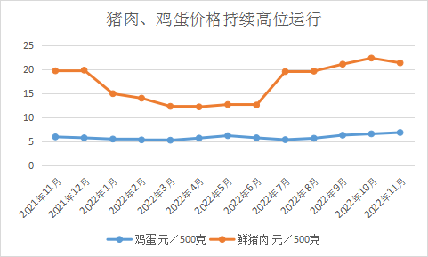 二是猪肉、鸡蛋价格持续高位运行。鲜猪肉平均零售价21.38元/斤,去年同期19.72元/斤,同比上涨8.42%;10月份同期22.38元/斤,同比下降4.47%。鸡蛋平均零售价6.81元/斤,去年同期5.9元/斤,同比上涨15.42%;10月份同期6.53元/斤,同比上涨4.29%。