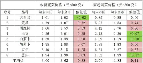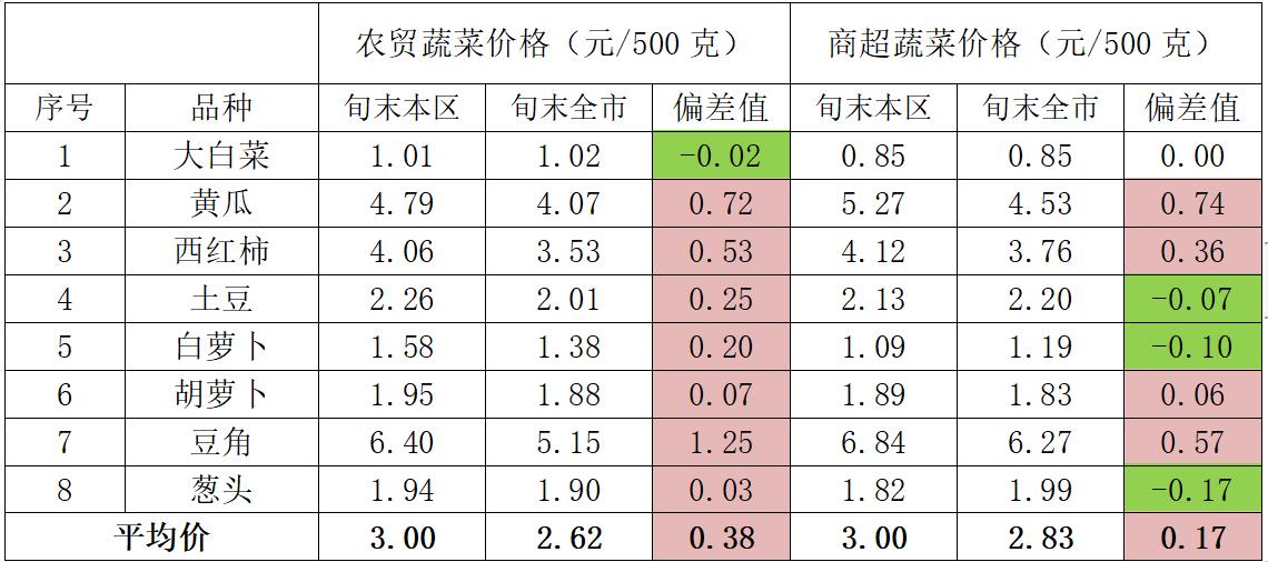 8种“当家菜”全区平均价格与全市平均价格对比,本旬我区农贸市场平均价3.00元/500克,较全市平均价高0.38元;商超平均价3.00元/500克,较全市平均价高0.17元。