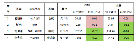 从1月上旬我区生活必需品市场整体价格监测情况看,与2022年12月下旬相比,粮油价格稳中有降,其中花生油、调和油价格出现小幅下降态势;副食品价格已降为主,其中猪肉价格春节前期逆势下降,猪肉本旬价格21.82元/500克,价格旬环比下降4.08%。鸡蛋价格较前期也出现明显下降,鸡蛋本旬价格6.20元/500克,价格旬环比下降2.72%;蔬菜价格本旬继续上涨。全区25个定点监测单位31种蔬菜旬平均价格3.85元/500克,价格旬环比上升2.89%。