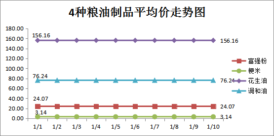 我区监测的8种粮、油中,富强粉、粳米、花生油、调和油4种代表品1月上旬商超、农贸市场平均价格及变化情况如下: