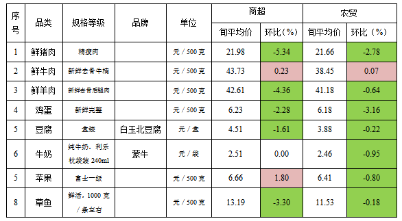 我区监测的13种副食品中猪牛羊肉、鸡蛋、豆腐、牛奶等8种代表品1月上旬商超、农贸市场平均价格及变化情况如下: