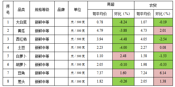 我区监测的31种蔬菜中大白菜、黄瓜、西红柿、土豆等8种“当家菜”1月上旬商超、农贸市场平均价格及变化情况如下: