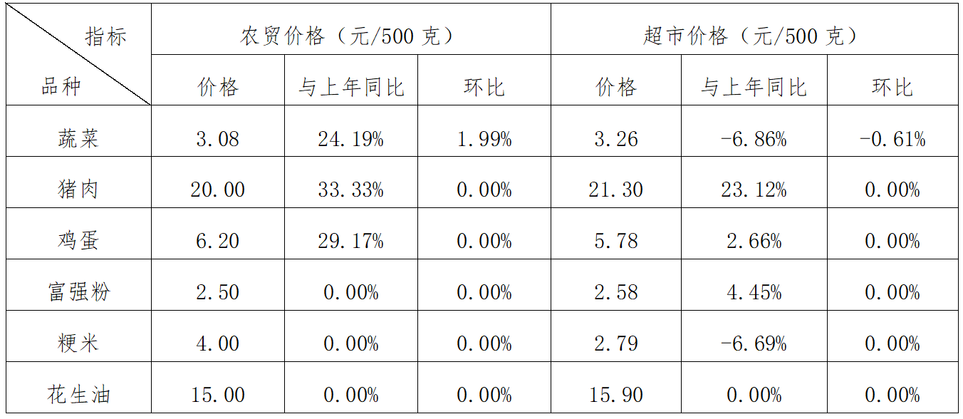 粮油:富强粉的农贸、超市平均价格分别为每500克2.50元、2.58元。粳米的农贸、超市平均价格分别为每500克4.00元、2.79元。花生油的农贸、超市平均价格分别为每500克15.00元、15.90元