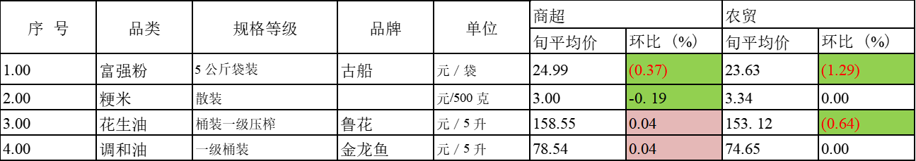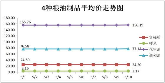 我区监测的 8 种粮、油中,富强粉、粳米、花生油、调 和油4 种代表品 5 月上旬商超、农贸市场平均价格及变化情况如下: