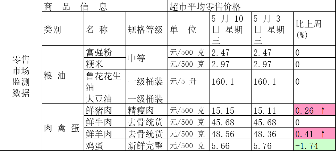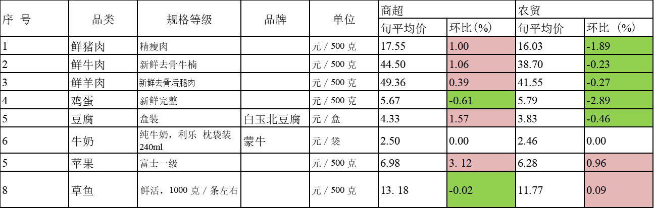 我区监测的 13 种副食品中猪牛羊肉、鸡蛋、豆腐、牛 奶等 8 种代表品 5 月上旬商超、农贸市场平均价格及变化情 况如下:
