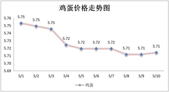 鸡蛋价格震荡下行。 生意社数据显示,5 月第 1 周,周 初鸡蛋价格为 9.46 元/公斤,周末鸡蛋价格为 9.34 元/公斤, 价格下跌 1.27% ,价格与去年同期相比下跌 7.06% 。南方降 雨偏多,鸡蛋储存难度加大,蛋价承压。