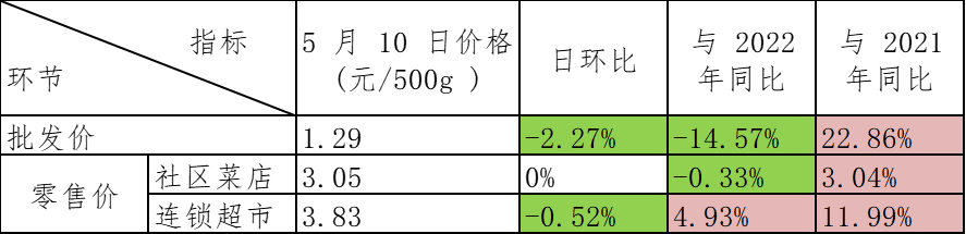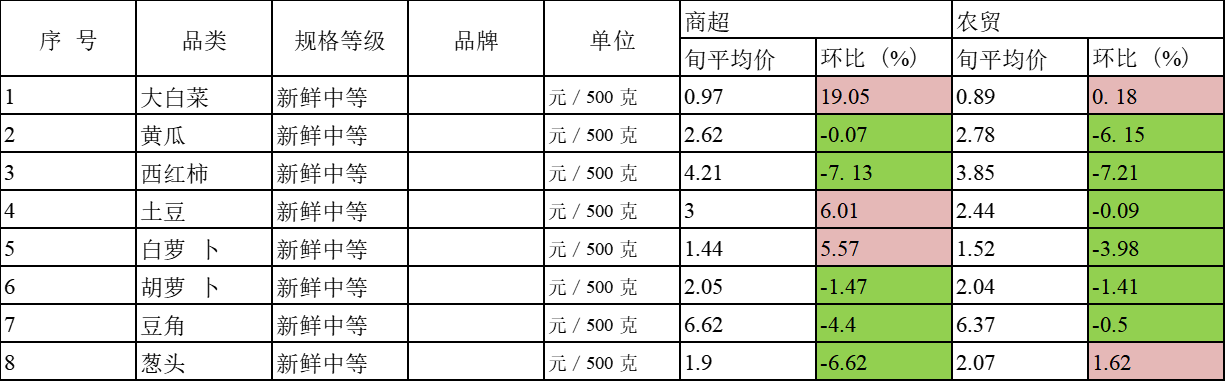 从 5 月上旬我区生活必需品市场整体价格监测情况看, 与 4 月下旬相比,粮油价格稳中有降,其中富强粉、粳米价 格出现微幅下降;副食品价格涨落不均,其中商超价格出现 小幅上涨,农贸价格出现小幅下降,鸡蛋价格本旬出现整体 小幅回落,本旬鸡蛋价格 5.73 元/500 克, 比 4 月下旬下降 0. 10 元/500 克,价格旬环比下降 1.78%;蔬菜价格自今年春 节以后持续走低,本旬价格已经逐渐企稳。8 种“当家菜” 中,大白菜、土豆、白萝 卜等冬季菜品价格出现上涨,黄瓜、 西红柿、豆角等应季蔬菜呈普遍下降态势。全区 25 个定点 监测单位 31 种蔬菜旬平均价格 3.50 元/500 克,价格旬环比 下降 0.75%。