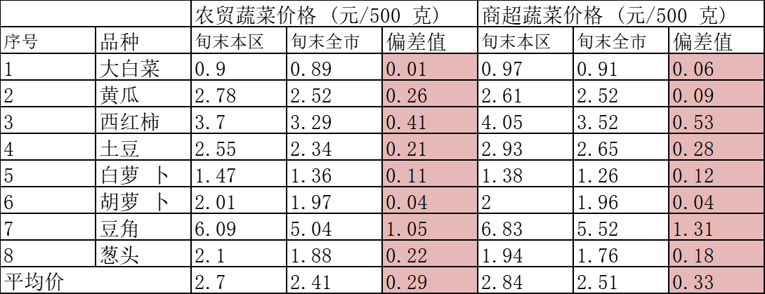 8 种“当家菜”全区平均价格与全市平均价格对比,本 旬我区农贸市场平均价 2.70 元/500 克,较全市平均价高 0.29 元;商超平均价 2.84 元/500 克,较全市平均价高 0.33 元。