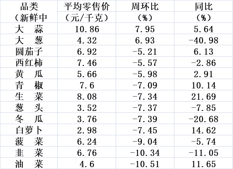8个监测点31种蔬菜周综合平均零售价格为6.78元/千克,环比下降3.14%,同比上涨7.62%。农贸价格为5.98元/千克,环比下降5.68%,同比上涨3.1%;超市价格为7.58元/千克,环比下降0.79%,同比上涨11.8%。