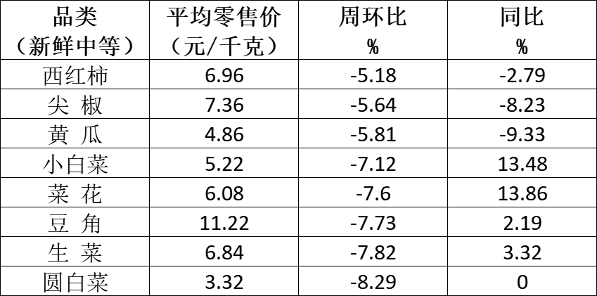 8个监测点31种蔬菜周综合平均零售价格为6.42元/千克,环比下降1.83%,同比上涨4.22%。农贸价格为5.62元/千克,环比下降2.77%,同比下降1.4%;超市价格为7.2元/千克,环比下降1.37%,同比上涨9.09%。