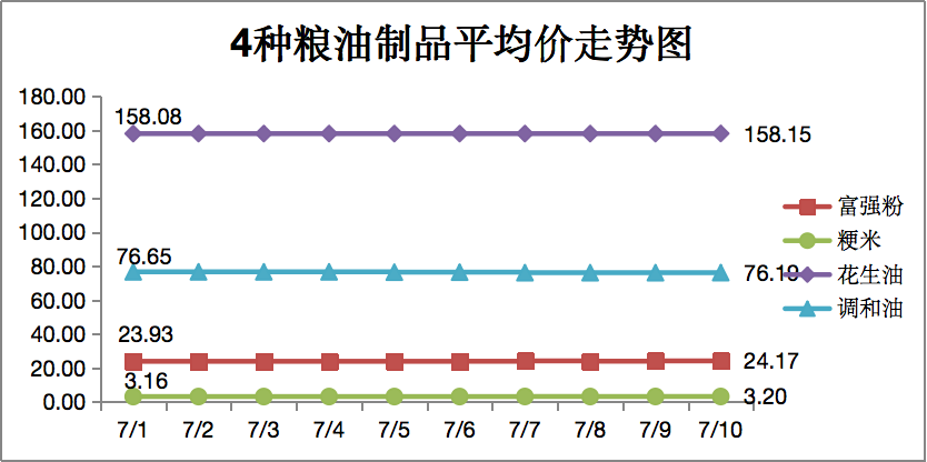 我区监测的8种粮、油中,富强粉、粳米、花生油、调和油4种代表品7月上旬商超、农贸市场平均价格及变化情况如下: