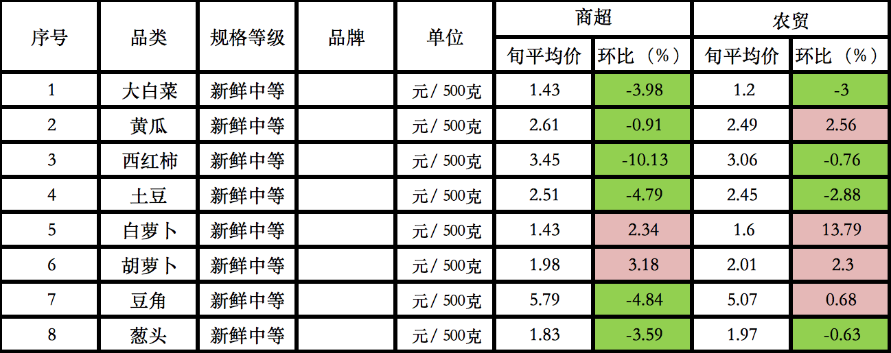 我区监测的31种蔬菜中大白菜、黄瓜、西红柿、土豆等8种“当家菜”7月上旬商超、农贸市场平均价格及变化情况如下:
