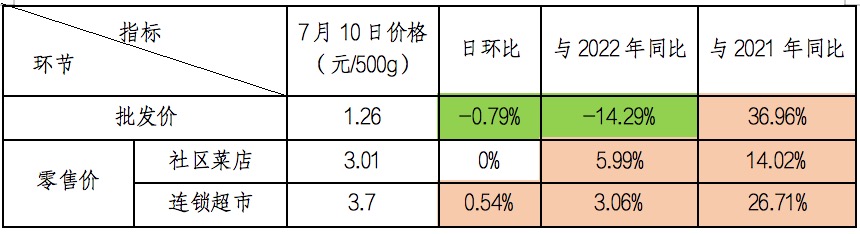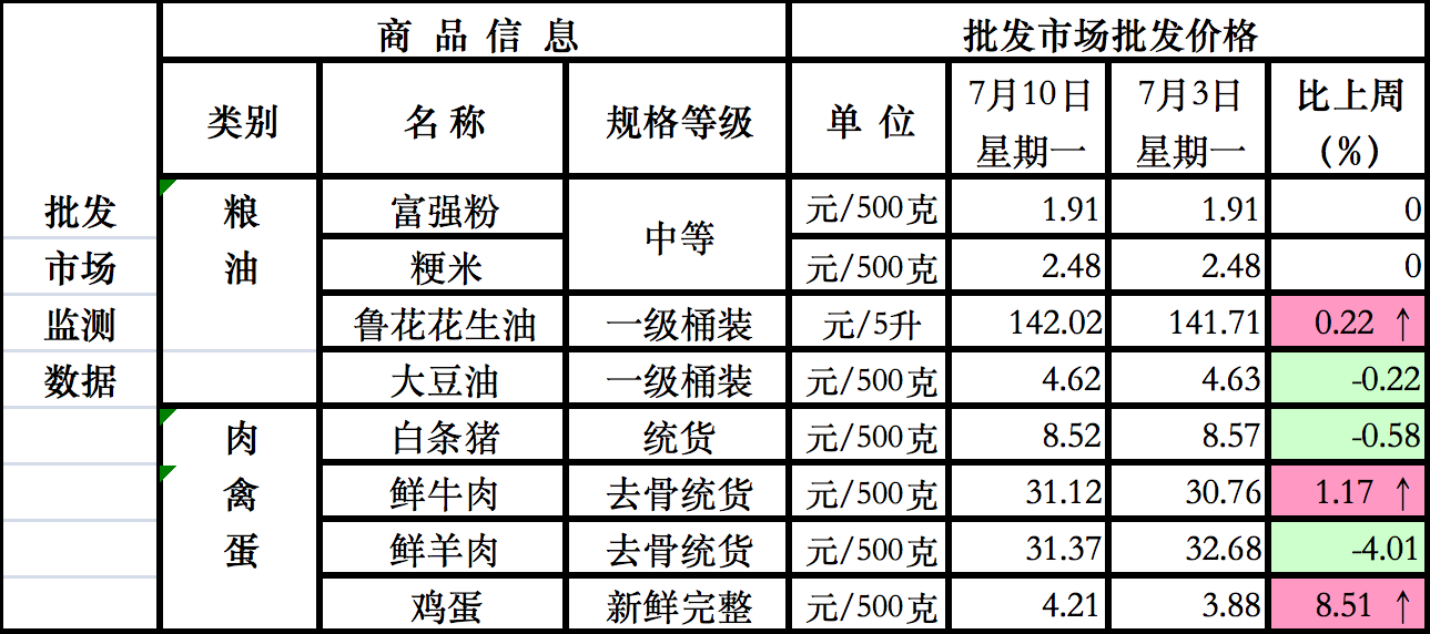 从7月上旬我区生活必需品市场整体价格监测情况看,与6月下旬相比,粮油价格稳中有降,其中粳米价格降幅较大;副食品价格以降为主,其中牛、羊肉、鸡蛋价格均有不同程度的下降,鸡蛋价格已连续一个月出现小幅下降。本旬鸡蛋价格5.36元/500克,比6月下旬下降0.15元/500克,价格旬环比下降2.89%,降幅较前期有所扩大;蔬菜价格受批发价格回落的影响,本旬零售价格继续快速回落。全区25个定点监测单位31种蔬菜旬平均价格3.49元/500克,价格旬环比下降3%。从同比情况看,7月10日全区蔬菜平均价格3.43元/500克比2022年同期3.46元/500克,下降0.03元/500克,同比下降0.87%。