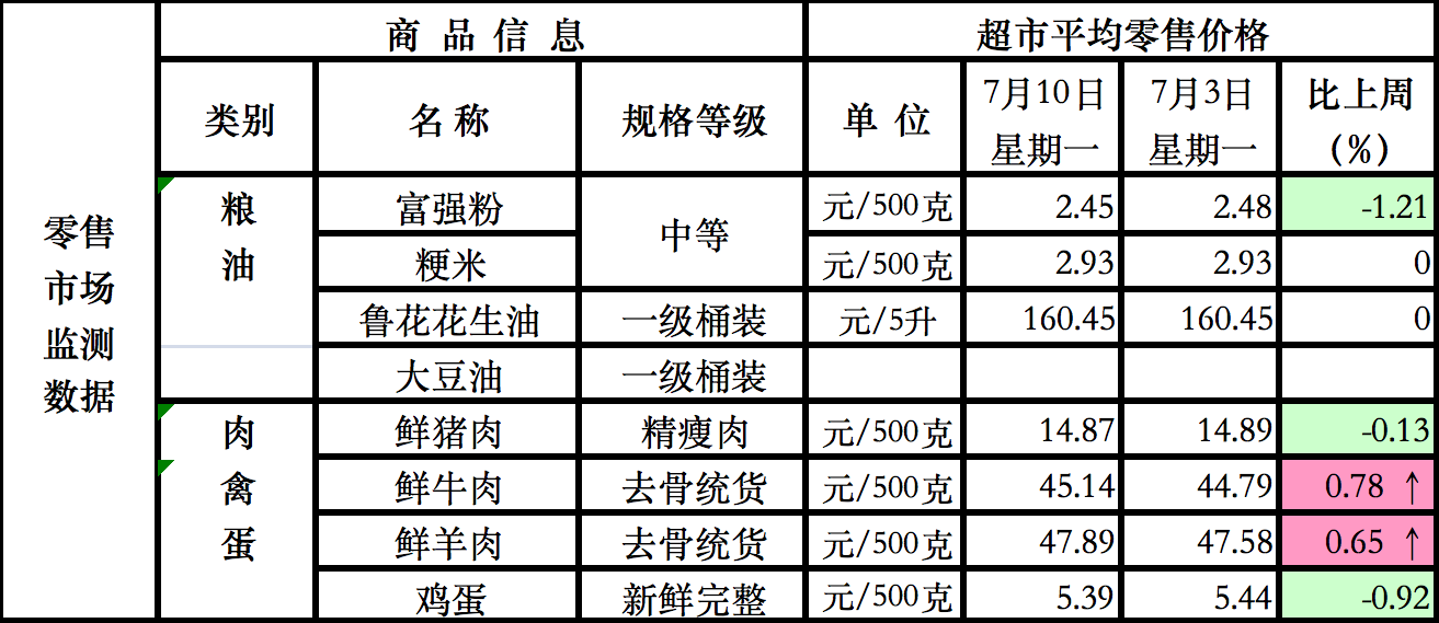 我区监测的13种副食品中猪牛羊肉、鸡蛋、豆腐、牛奶等8种代表品7月上旬商超、农贸市场平均价格及变化情况如下: