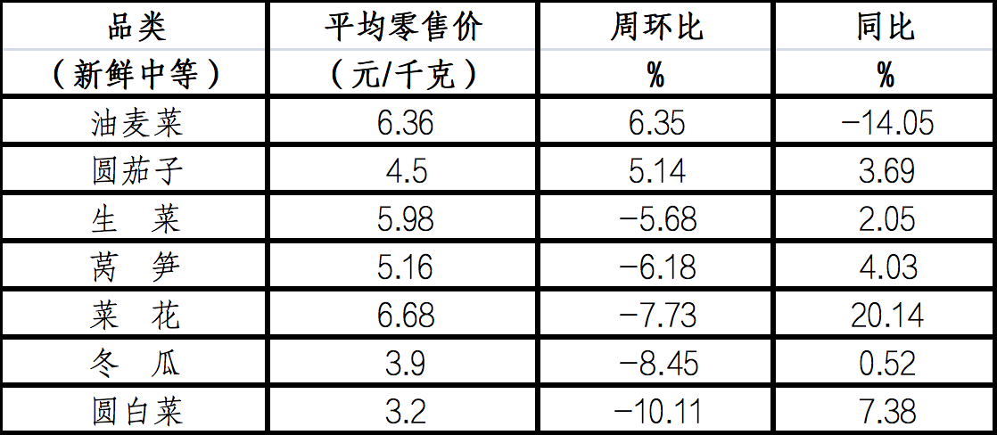 蔬菜生产和运输保持畅通,本周蔬菜价格重回季节性下降通道,蔬菜价格小幅波动,预计后期蔬菜价格仍将继续呈季节性回落,但下降幅度会逐步缩小。