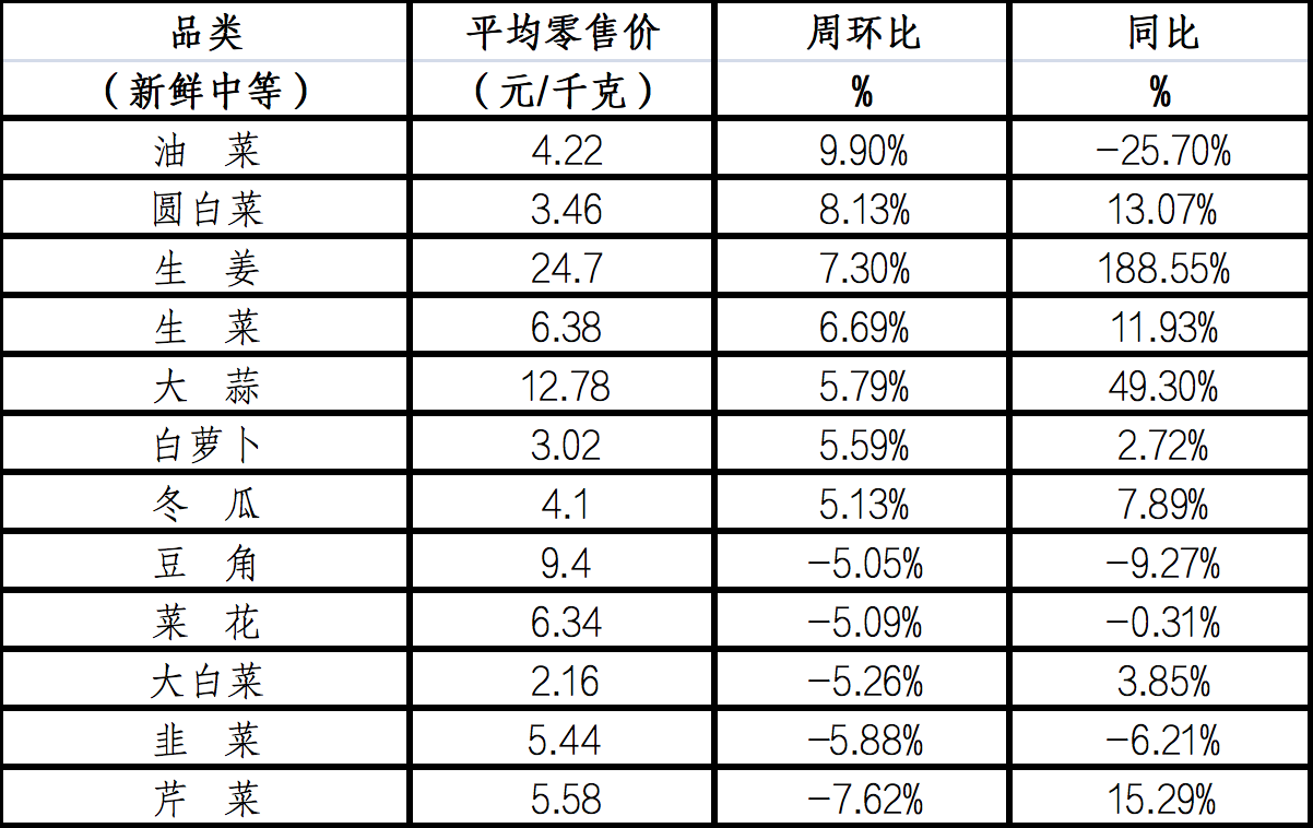 8个监测点31种蔬菜周综合平均零售价格为6.38元/千克,环比上涨1.59%,同比上涨3.24%。农贸价格为5.78元/千克,环比上涨1.05,同比下降0.69%;超市价格为6.96元/千克,环比上涨1.75%,同比上涨6.75%。