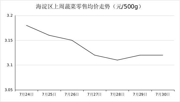 上周,海淀区蔬菜零售均价波动下降,受周末降雨带动叶菜价格上涨影响,周末价格小幅反弹。上周零售均价为3.14元/500克,环比上涨1.53%。