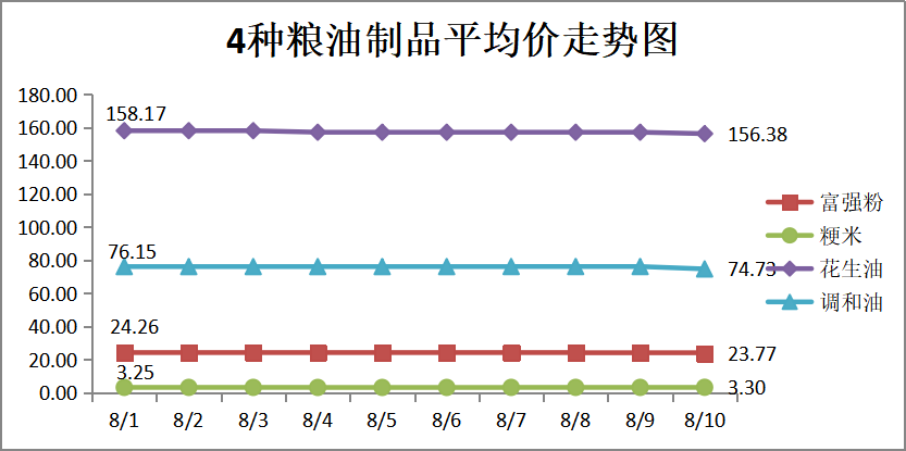 我区监测的8种粮、油中,富强粉、粳米、花生油、调和油4种代表品8月上旬商超、农贸市场平均价格及变化情况如下: