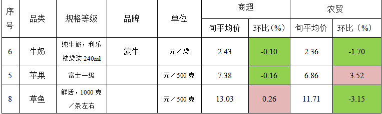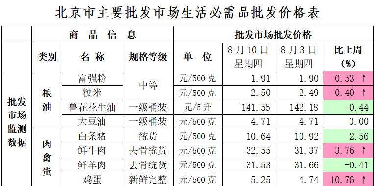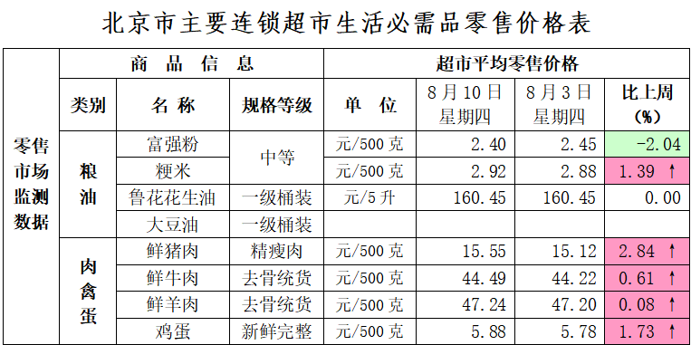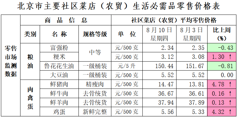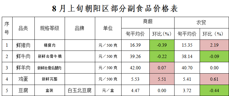 我区监测的13种副食品中猪牛羊肉、鸡蛋、豆腐、牛奶等8种代表品8月上旬商超、农贸市场平均价格及变化情况如下: