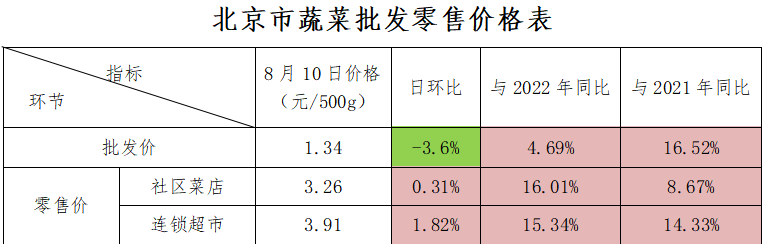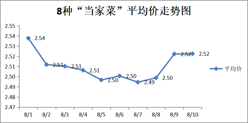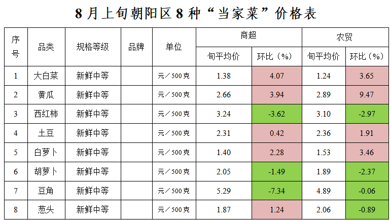 我区监测的31种蔬菜中大白菜、黄瓜、西红柿、土豆等8种“当家菜”8月上旬商超、农贸市场平均价格及变化情况如下: