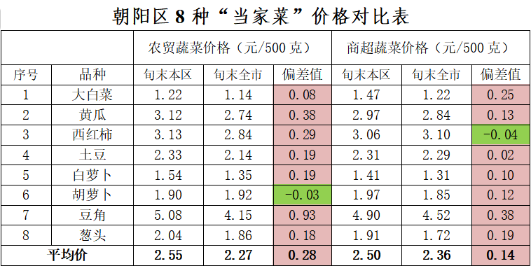 8种“当家菜”全区平均价格与全市平均价格对比,本旬我区农贸市场平均价2.55元/500克,较全市平均价高0.28元;商超平均价2.50元/500克,较全市平均价高0.14元。