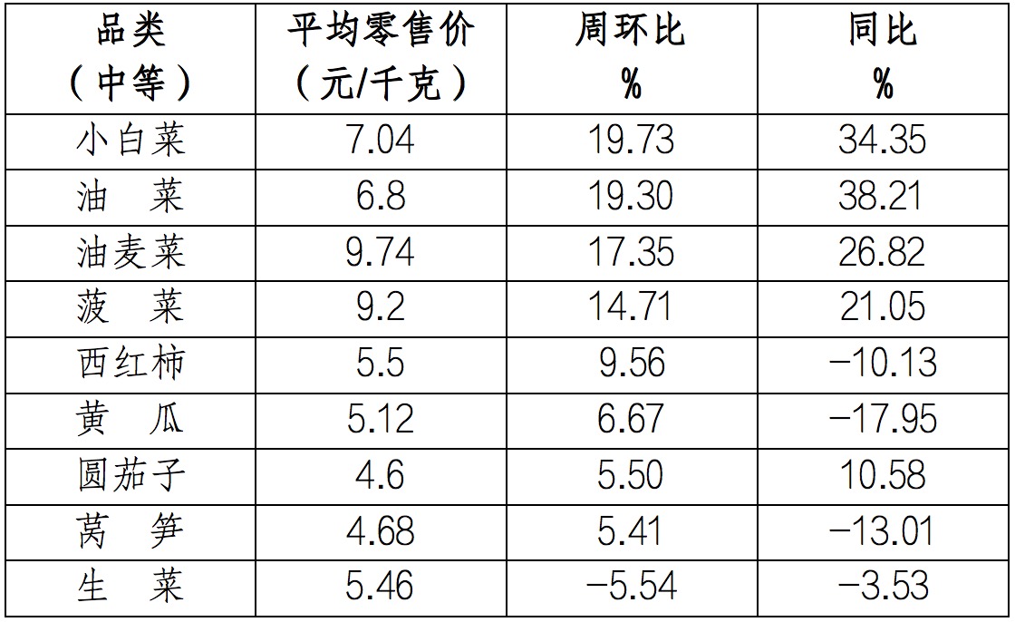 8个监测点31种蔬菜周综合平均零售价格为6.76元/千克,环比上涨3.36%,同比上涨12.29%。农贸市场价格为6.3元/千克,环比上涨5.7%,同比上涨11.31%;超市价格为7.2元/千克,环比上涨1.12%,同比上涨13.21%。