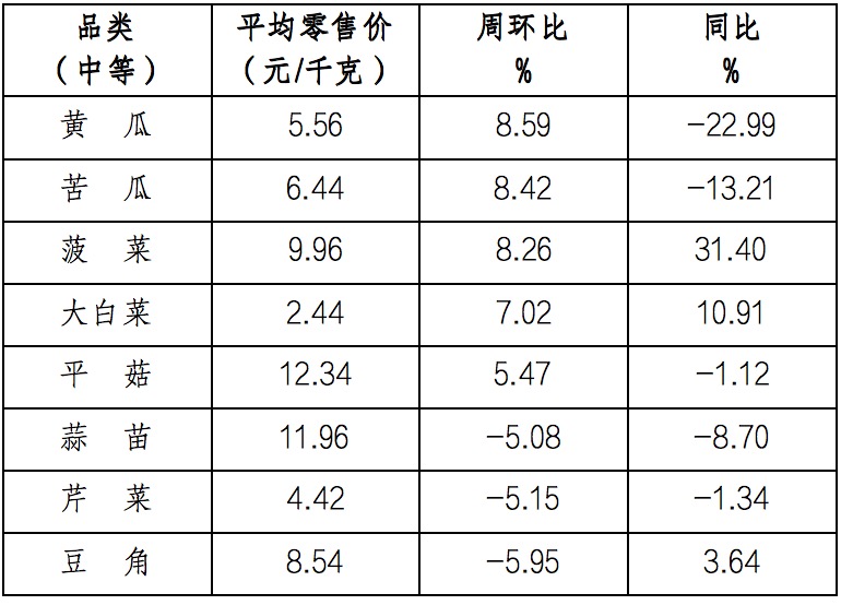 8个监测点31种蔬菜周综合平均零售价格为6.84元/千克,环比上涨1.18%,同比上涨13.25%。农贸市场价格为6.34元/千克,环比上涨0.63%,同比上涨10.84%;超市价格为7.32元/千克,环比上涨1.67%,同比上涨15.46%。