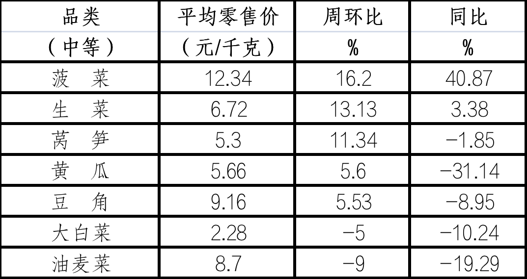 8个监测点31种蔬菜周综合平均零售价格为6.96元/千克,环比上涨1.46%,同比上涨5.45%。农贸市场价格为6.54元/千克,环比上涨2.51%,同比上涨7.57%;超市价格为7.34元/千克,环比上涨0.55%,同比上涨3.38%。