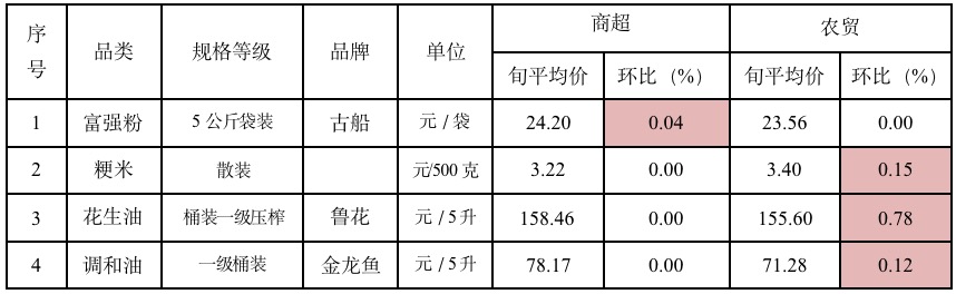 我区监测的8种粮、油中,富强粉、粳米、花生油、调和油4种代表品8月下旬商超、农贸市场平均价格及变化情况如下: