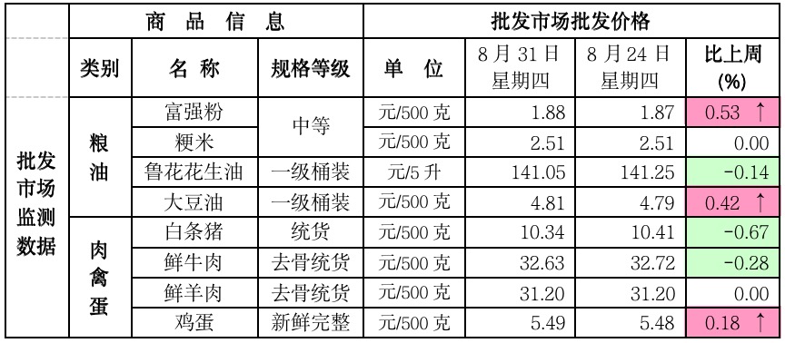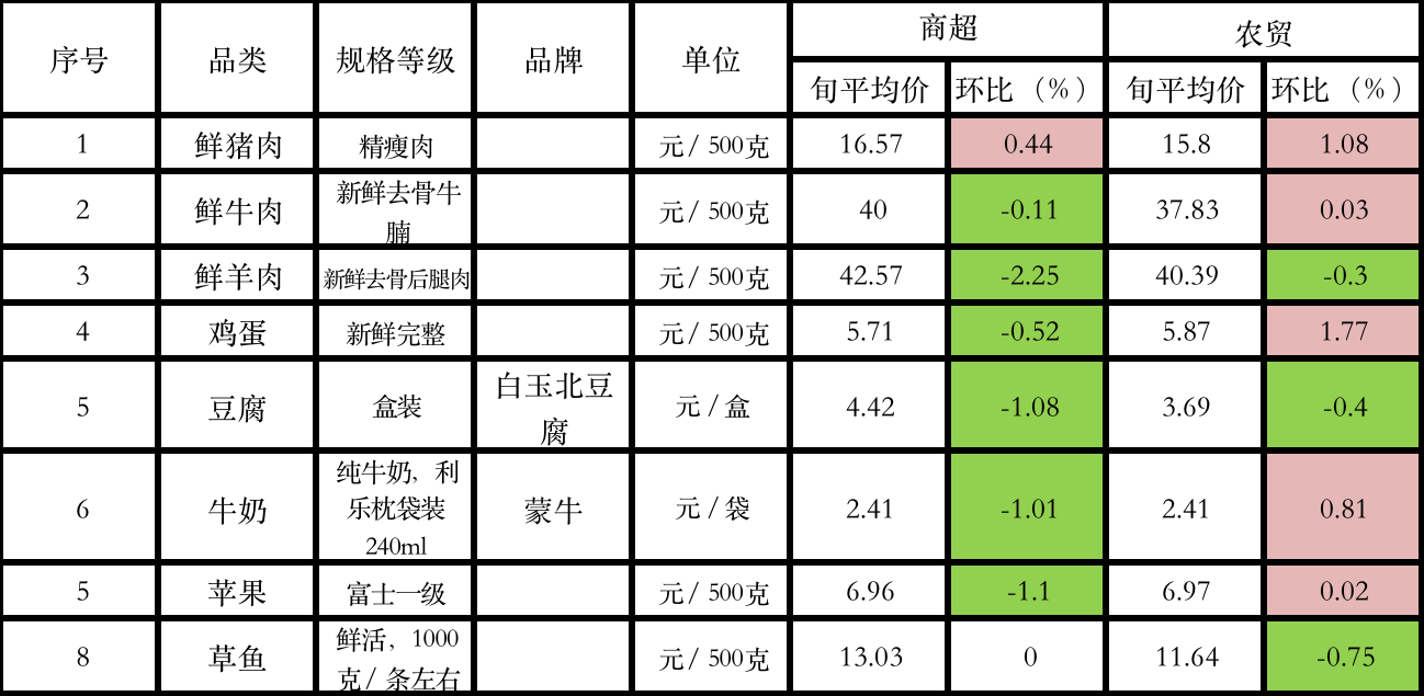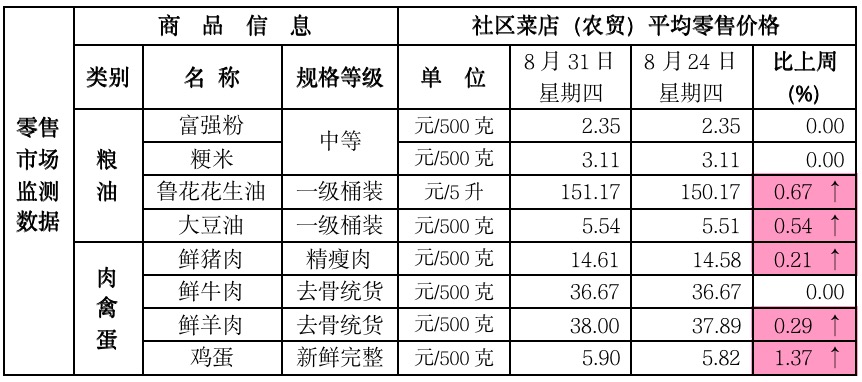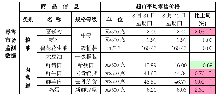 我区监测的13种副食品中猪牛羊肉、鸡蛋、豆腐、牛奶等8种代表品8月下旬商超、农贸市场平均价格及变化情况如下: