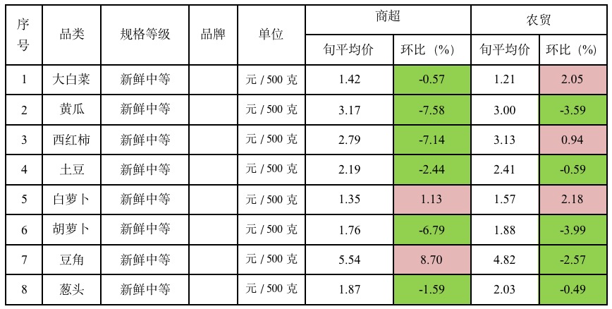 我区监测的31种蔬菜中大白菜、黄瓜、西红柿、土豆等8种“当家菜”8月下旬商超、农贸市场平均价格及变化情况如下: