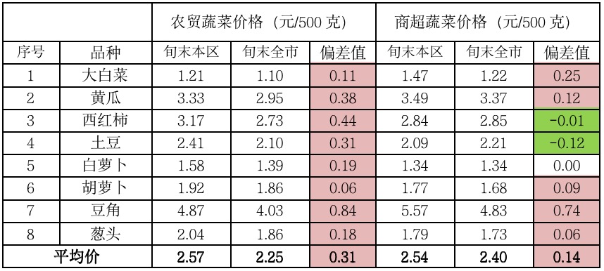 8种“当家菜”全区平均价格与全市平均价格对比,本旬我区农贸市场平均价2.57元/500克,较全市平均价高0.31元;商超平均价2.54元/500克,较全市平均价高0.14元。