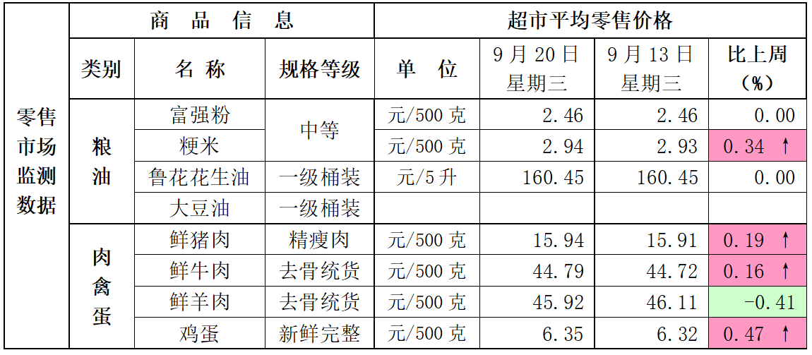 我区监测的13种副食品中猪牛羊肉、鸡蛋、豆腐、牛奶等8种代表品9月中旬商超、农贸市场平均价格及变化情况如下: