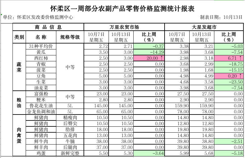 怀柔区发改委本周市场监测情况(10.7--10.13)