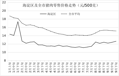 前三季度,海淀区猪肉零售旬均价走势呈现先快涨快降、后波动上行走势,整体呈波动下行走势,趋势上与全市零售价一致。前三季度全区猪肉旬均价格为12.20元/500克,一、二、三季度旬均价格分别为13.21元/500克、11.40元/500克、11.99元/500克,二、三季度旬均价格环比涨幅分别为-13.73%、5.16%。