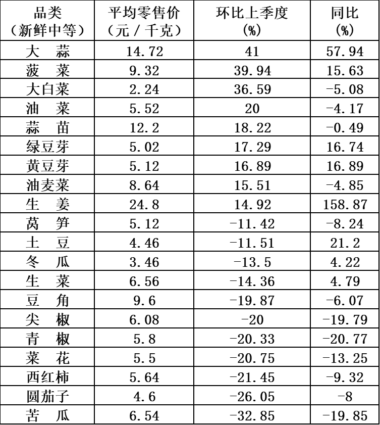 三季度的高温、极端降雨天气等因素,不利于蔬菜的生长和采收,运输效率降低,供应有所下降,自7月起蔬菜价格呈上涨走势,8月蔬菜价格小幅波动,9月受中秋、国庆双节影响,蔬菜价格持续高位运行。