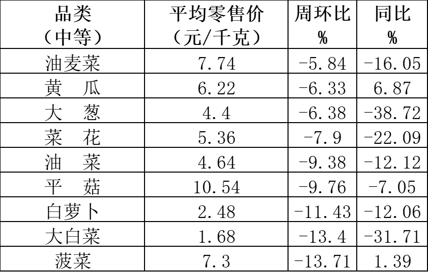 8个监测点31种蔬菜周综合平均零售价格为6.64元/千克,环比下降2.92%,同比上涨0.3%。农贸市场价格为6.22元/千克,环比下降4.01%,同比上涨1.63%;超市价格为7.08元/千克,环比下降1.94%,同比下降0.28%。