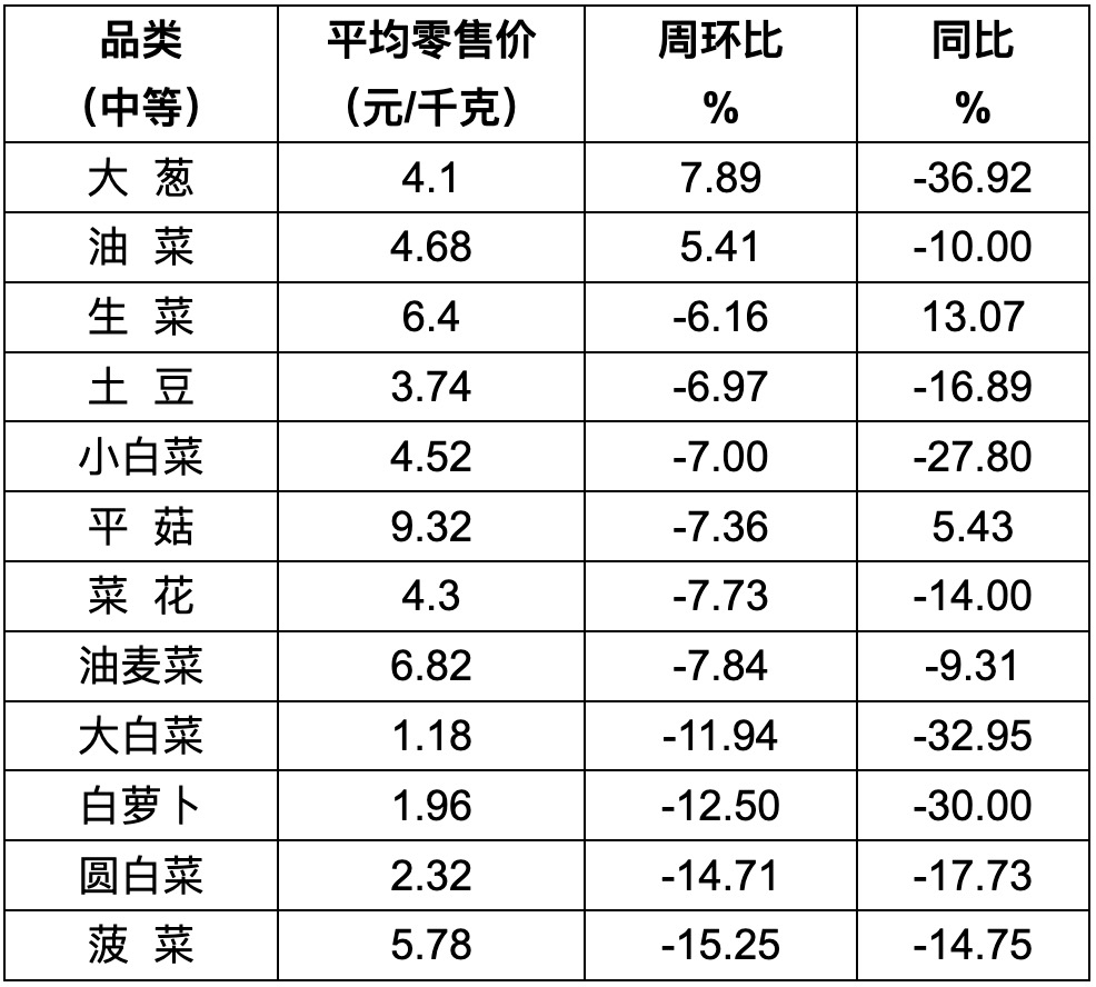 8个监测点31种蔬菜周综合平均零售价格为6.24元/千克,环比下降2.5%,同比上涨1.63%。农贸市场价格为5.78元/千克,环比下降3.02%,同比上涨1.05%;超市价格为6.68元/千克,环比下降2.05%,同比上涨1.83%。
