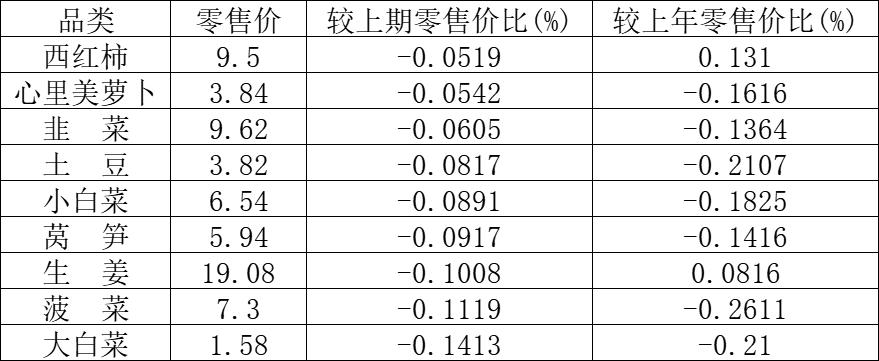 8个监测点31种蔬菜周综合平均零售价格为7.38元/千克,环比下降3.4%,同比下降10.44%。农贸市场价格为7.18元/千克,环比下降6.02%,同比下降10.03%;超市价格为7.58元/千克,环比下降0.79,同比下降10.82%。
