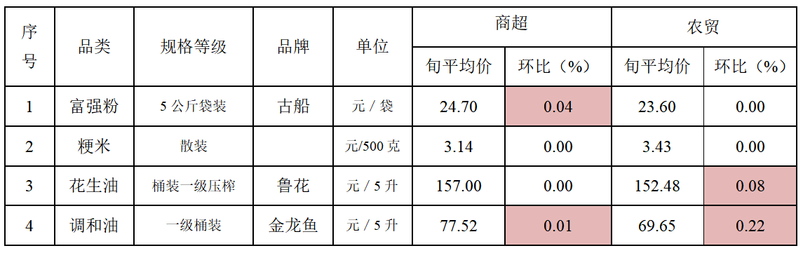 我区监测的8种粮、油中,富强粉、粳米、花生油、调和油4种代表品2月中旬商超、农贸市场平均价格及变化情况如下: