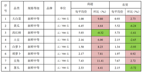 8种“当家菜”全区平均价格与全市平均价格对比,本旬我区农贸市场平均价3.33元/500克,较全市平均价高0.27元;商超平均价3.50元/500克,较全市平均价高0.21元。
