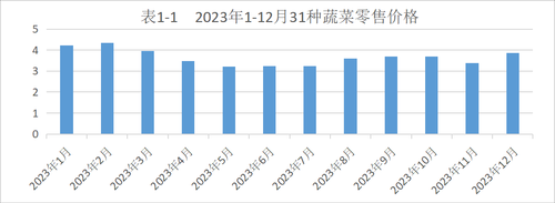 全年监测的31种蔬菜平均零售价格3.66元/500克,同比上涨4.31%。零售价格最高的是生姜和蒜苗,平均价格分别是11.82元/500克和7.99元/500克;零售价格最低的是大白菜和白萝卜,平均价格分别是0.94元/500克和1.35元/500克。总体来看,一季度,受降雪天气及节日效应等因素影响,采摘、运输环节费用增加,蔬菜平均价格4.17元/500克;二季度,受季节性因素影响,蔬菜价格规律性回落,5月份平均价格降至3.22元/500克;三季度,由于进入汛期受连续降雨影响,蔬菜产量减少,带动整体蔬菜价格微幅上涨;四季度,秋冬季节蔬菜上市量增加,以及部分连锁超市冬储菜“两不涨”等保供稳价措施持续推进,带动整体蔬菜价格呈先降后涨态势。