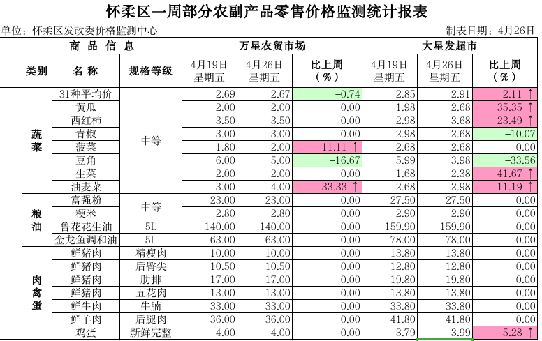 北京市怀柔区发改委本周市场监测情况(4月19日--4月26日)