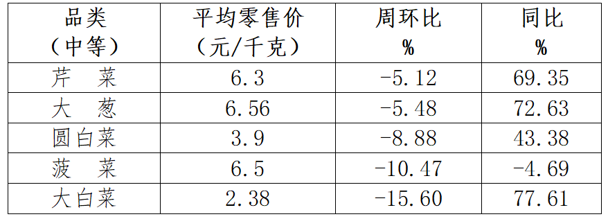 8个监测点31种蔬菜周综合平均零售价格为7.48元/千克,环比下降1.58%,同比上涨16.88%。农贸市场价格为7.26元/千克,环比下降1.63%,同比上涨21.82%;超市价格为7.7元/千克,环比下降1.28%,同比上涨12.9%。