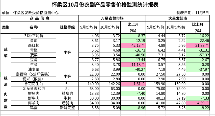 10月份据怀柔区发展和改革委员会价格监测数据显示:我区3家农贸市场、4家超市(包括社区菜店)货源供应充足,蔬菜、鸡蛋价格下降,猪牛羊肉价格涨跌互现,粮油等副食品价格基本稳定。