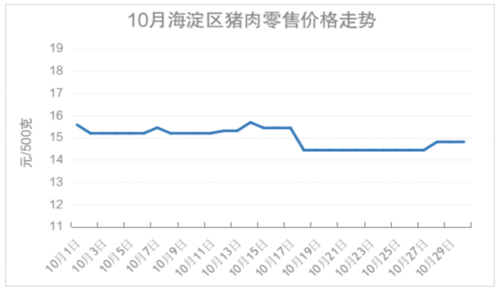10月份,海淀区猪肉月均价为14.96元/500克,环比9月份小幅下降5.08%。本月猪肉单日价格区间为14.43-15.68元/500克,整体价格呈波动略降趋势。月初价格从15.57元/500克降至15.19元/500克持续运行至6日,7日出现小幅波动后再次回落至15.19元/500克,运行4日后上涨,14日涨至本月最高15.68元/500克,15日出现小幅回落,18日出现明显下滑,降至本月最低14.43元/500克,持续运行至27日,月末价格微幅回弹收于14.8元/500克,月底较月初价格下降4.95%。