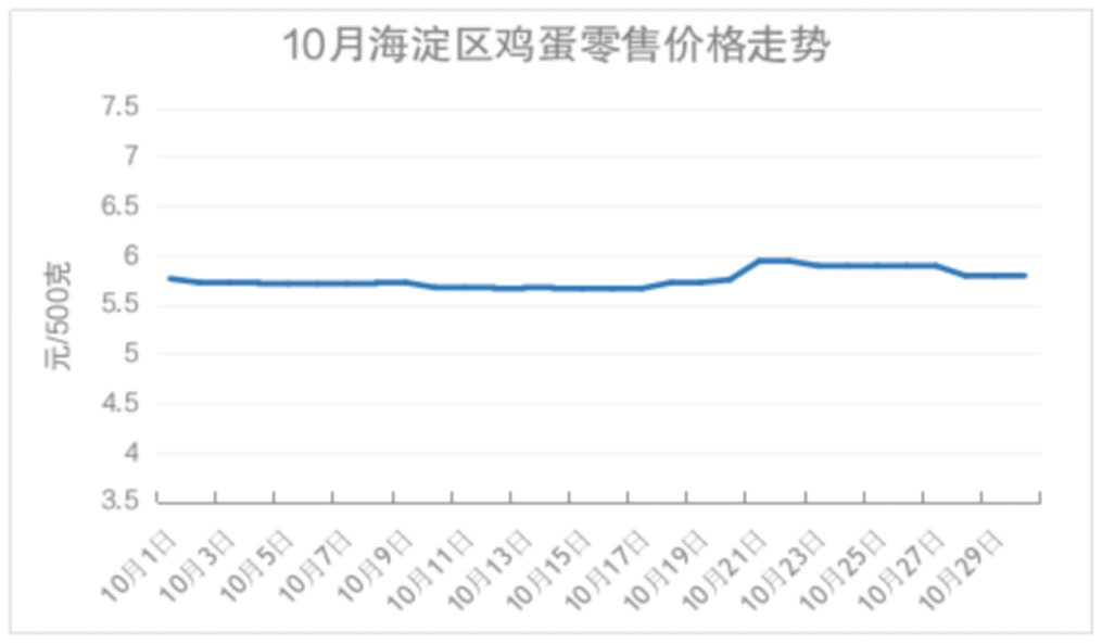 10月份,海淀区鸡蛋月均价为5.76元/500克,环比9月份小幅下降6.19%。本月鸡蛋单日价格区间为5.66-5.94元/500克,整体呈稳中微涨趋势。月初至17日价格从5.76元/500克降至5.66元/500克,18日价格出现回弹,21日涨至本月最高价5.94元/500克,运行2日后价格缓慢下降,从5.94元/500克持续下降至5.77元/500克,月底较月初价格微幅上涨0.17%。