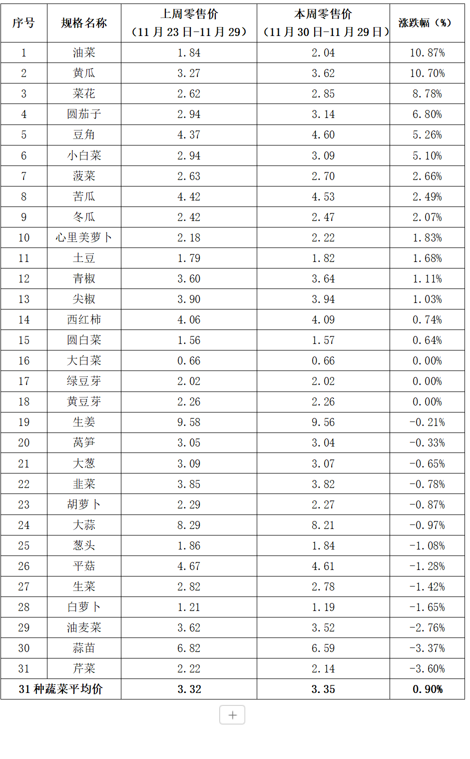 三、蔬菜价格季节性上涨。受季节性因素影响,本周蔬菜价格小幅上升。监测超市、农贸市场31个监测蔬菜品种周平均价3.35元/500克,周环比上涨0.90%,呈15种上涨、3种持平、13种下降态势,价格上涨的品种主要为油菜、黄瓜和菜花,周环比分别上涨10.87%、10.70%和8.78%;降幅较大的品种主要为油麦菜、蒜苗和芹菜,周环比分别下降2.76%、3.37%和3.60%。